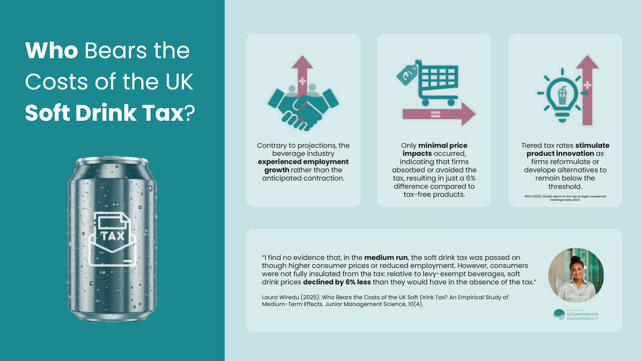 Hier setzt die Forschung von Laura Wiredu an der Universität Paderborn an. In ihrer Masterarbeit untersuchte sie die mittelfristigen Auswirkungen der britischen Abgabe auf Erfrischungsgetränke in den fünf Jahren seit ihrer Einführung. Ihre Studie wurde kürzlich in der Fachzeitschrift Junior Management Science veröffentlicht. Wir freuen uns sehr, dass sie ihre akademische Laufbahn nun als Doktorandin im Rahmen des TRR 266 fortsetzt.