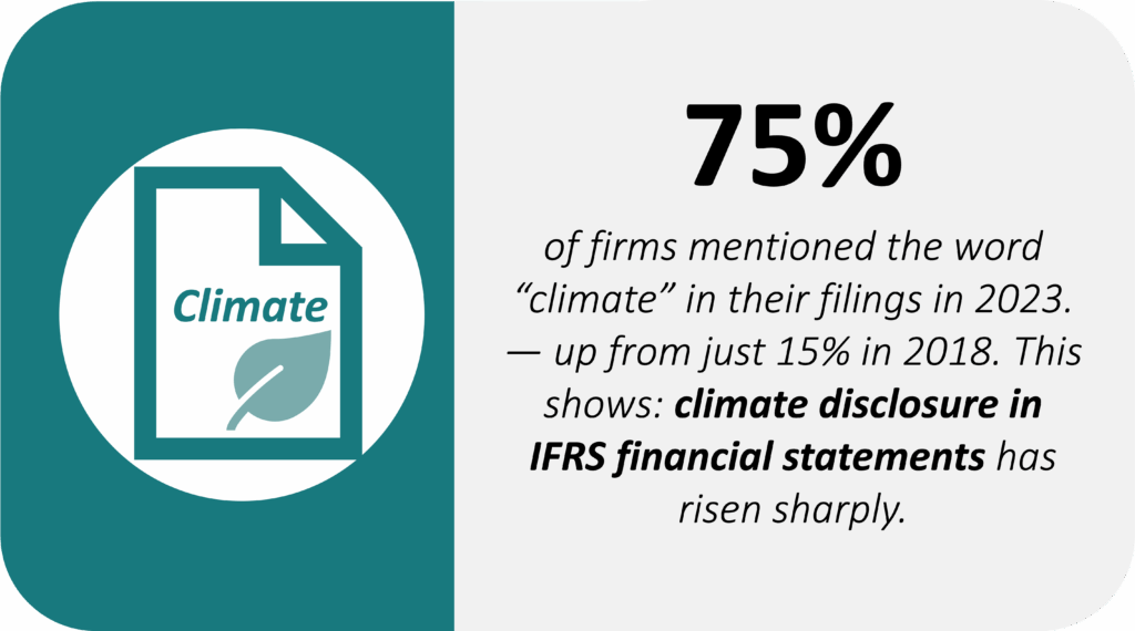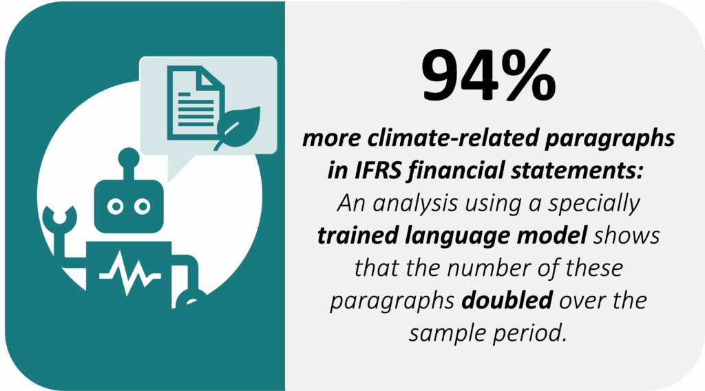 Between 2018 and 2023, climate-related disclosures in IFRS financial statements rose sharply. In 2018, just 15 percent of firms mentioned the word “climate” in their filings; by 2023, that figure had jumped to 75 percent. Similarly, using a language model trained to identify climate-related paragraphs, the research documents that climate-related paragraphs doubled over the sample period. The turning point came in 2021, when the European Securities and Markets Authority (ESMA) declared climate-related disclosures a top enforcement priority. Companies based in countries with more active enforcement authorities reported substantially more climate-related information, pointing to regulatory pressure as a key driver.